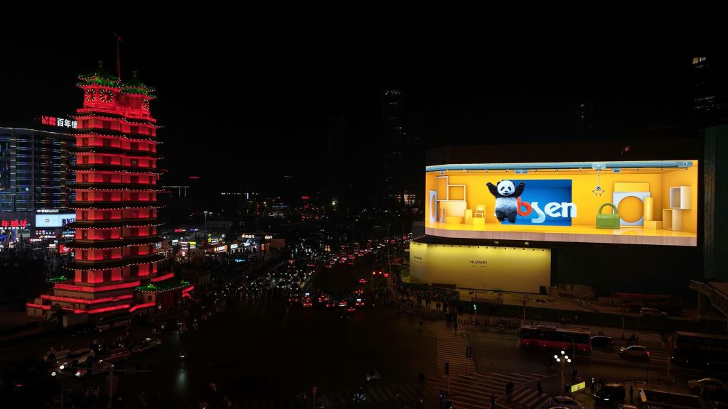 The unique value of the Zhengzhou Hualian Department Store giant screen lies not only in its “three-in-one” physical form but also in its pioneering “split-and-combine operation” model. The three screen surfaces can operate independently, precisely covering pedestrian flow from specific directions. More importantly, they can be linked across the entire area, turning the entire building into an ultra-wide narrative canvas for playing naked-eye 3D content or continuous brand storylines, creating “urban micro-films.”