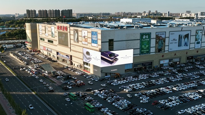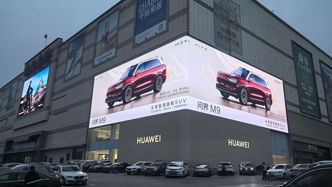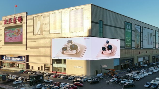 Huawei Smart Life Store’s 3D LED display at Eurasia Shopping Mall in Changchun features Northeast China’s highest resolution and a 90° corner design, illuminating the façade of the world’s largest single-building mall.
