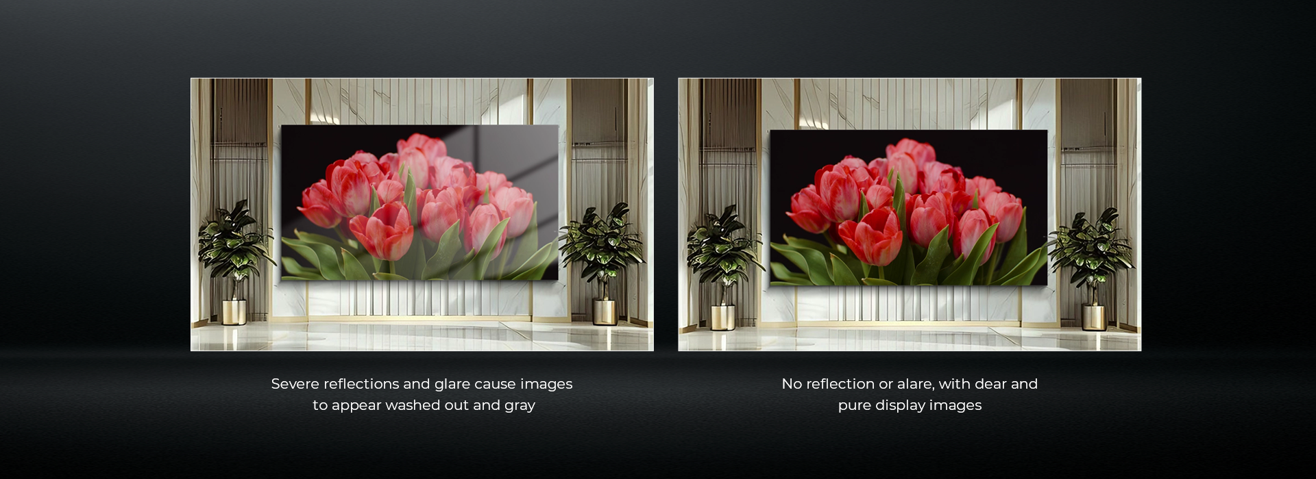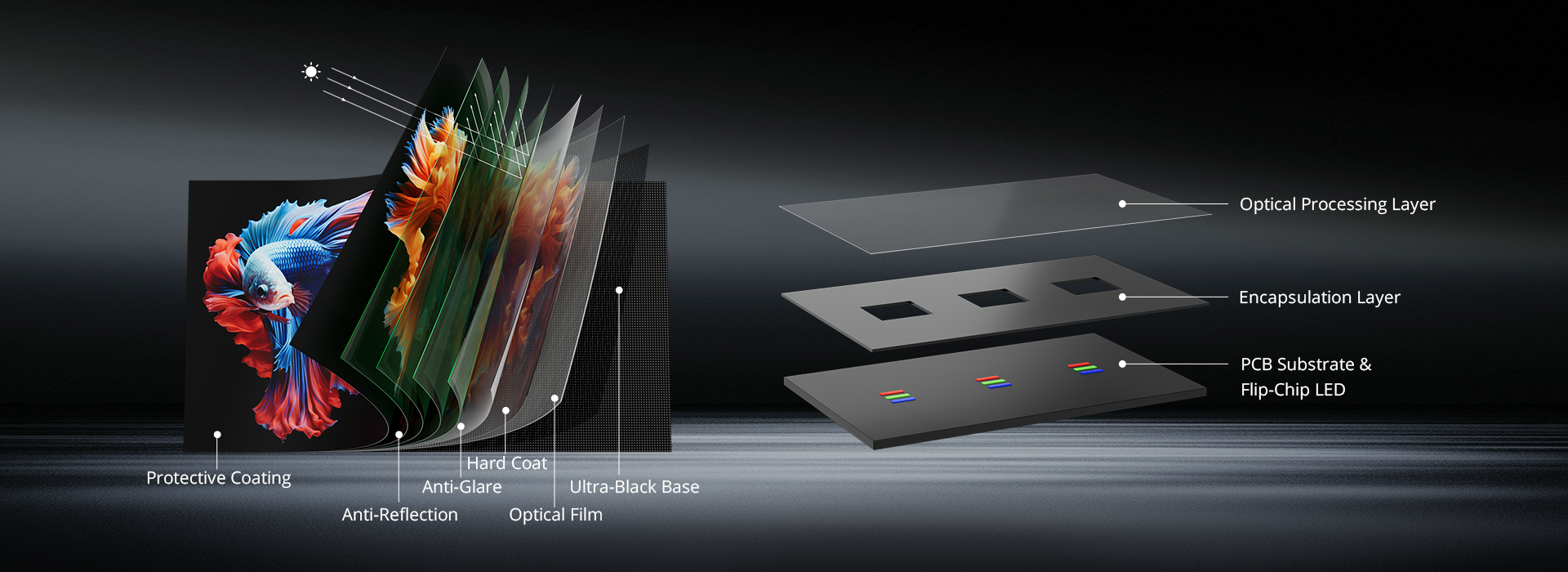 To address poor screen visibility caused by strong ambient reflections, this technology combines 9-layer HTB ultra-black encapsulation with AR+AG anti-reflection and anti-glare treatments. It significantly reduces ambient light interference, ensuring the display remains clearly visible in high-glare environments and comfortable to view throughout the day.