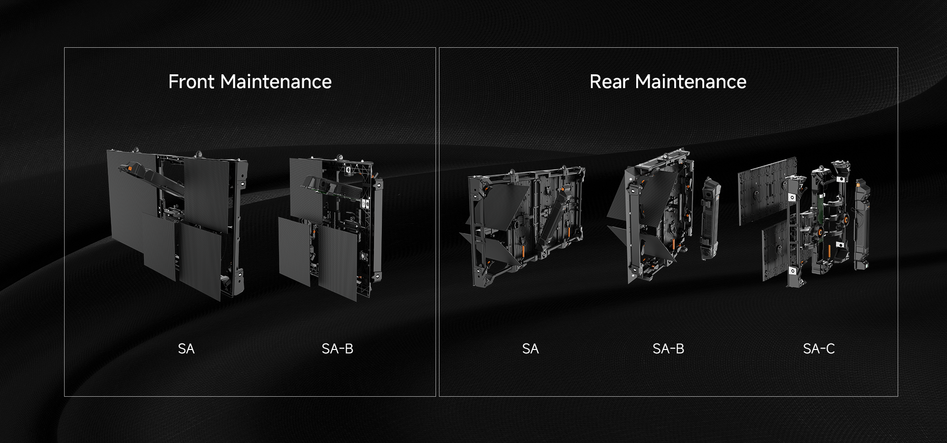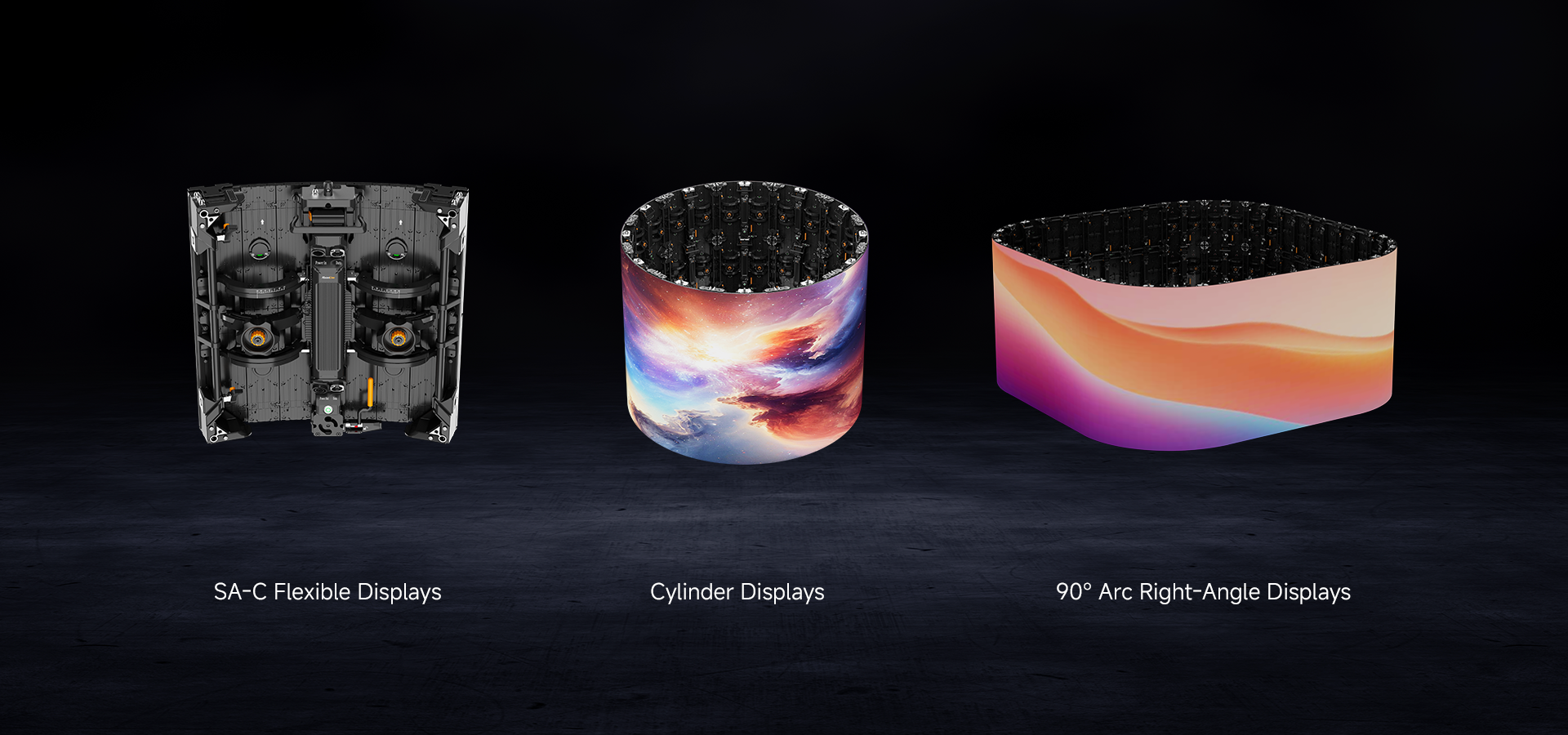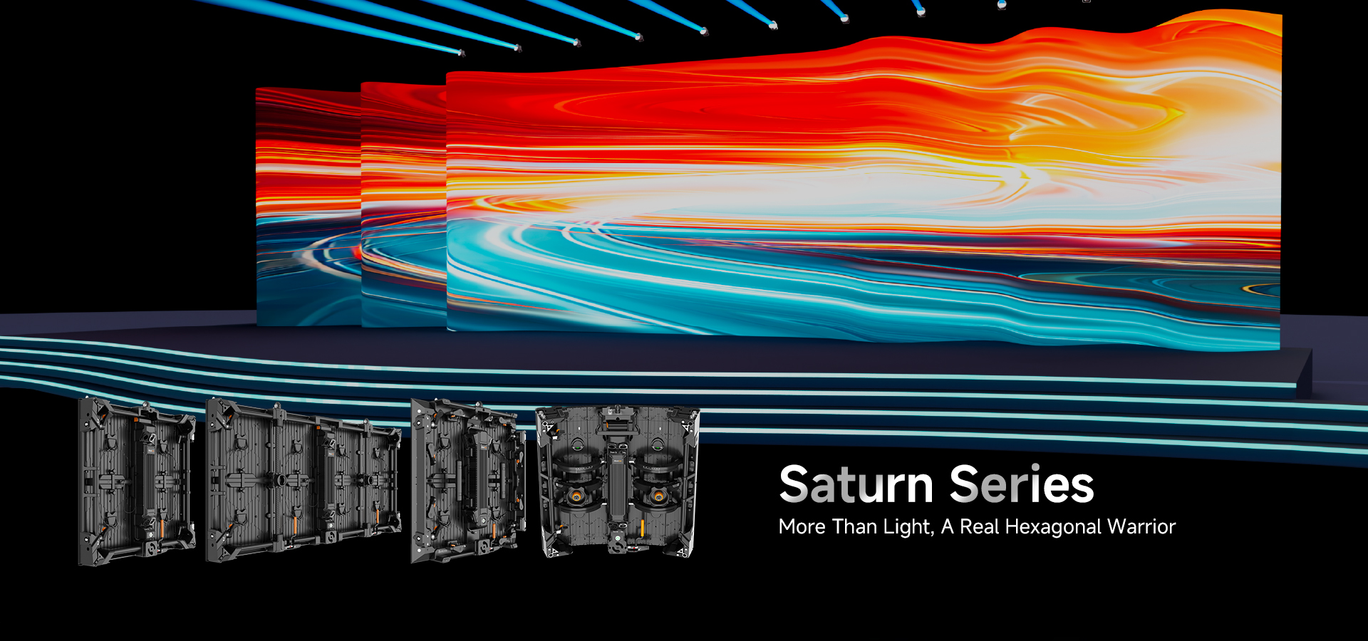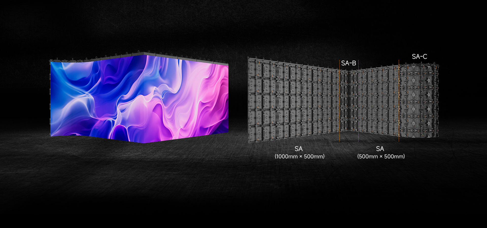 The Saturn-C (SA-C) flexible displays enhance creative freedom with a precision gear transmission mechanism, allowing easy adjustments of each panel from -30° to +30° in 1.25° increments. This enables the effortless creation of seamless curves, S-shapes, and cylinders starting from a 1.91-meter diameter (12 panels). When paired with SA panels, these displays open up even more possibilities for innovative stage design.